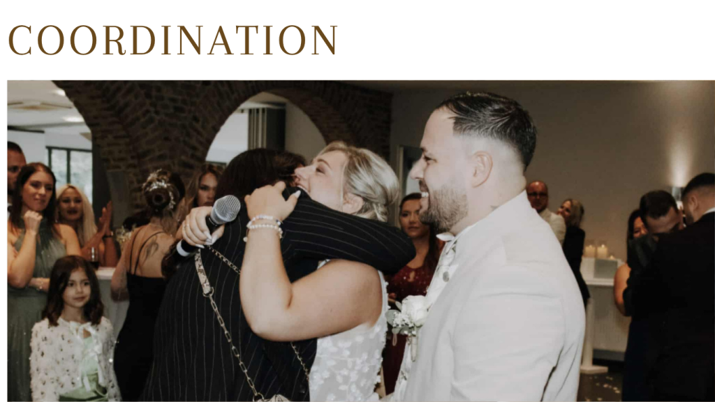 - J’accueille votre famille et les prestataires, j’organise les déplacements vers la commune, la cérémonie et le lieu de réception, et je mets en place chaque étape clé de votre mariage.